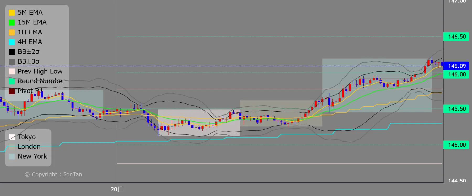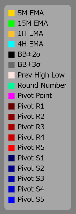 Carta PontAN menunjukkan pergerakan harga selama 5 hari, termasuk hari yang direkodkan dalam jurnal. Hanya carta 15 minit yang dipaparkan. Anda boleh memperbesar dan menurunkan dengan roda tetikus, dan anda boleh menyemak pergerakan harga masa lalu dengan menatal kiri dan kanan. Garis menegak menunjukkan garis perubahan tarikh dan sentiasa dipaparkan, tetapi bergantung pada pembesaran, tarikh di bahagian bawah mungkin ditinggalkan. Carta untuk hari jurnal dikemas kini secara automatik setiap 15 minit. Apabila tarikh berubah, hanya carta yang sepadan dengan jurnal hari itu tertakluk kepada kemas kini berikutnya, dan carta untuk tarikh lain ditetapkan. Tujuannya adalah untuk “menyimpan sejarah carta yang dilihat dalam masa nyata pada hari itu.”